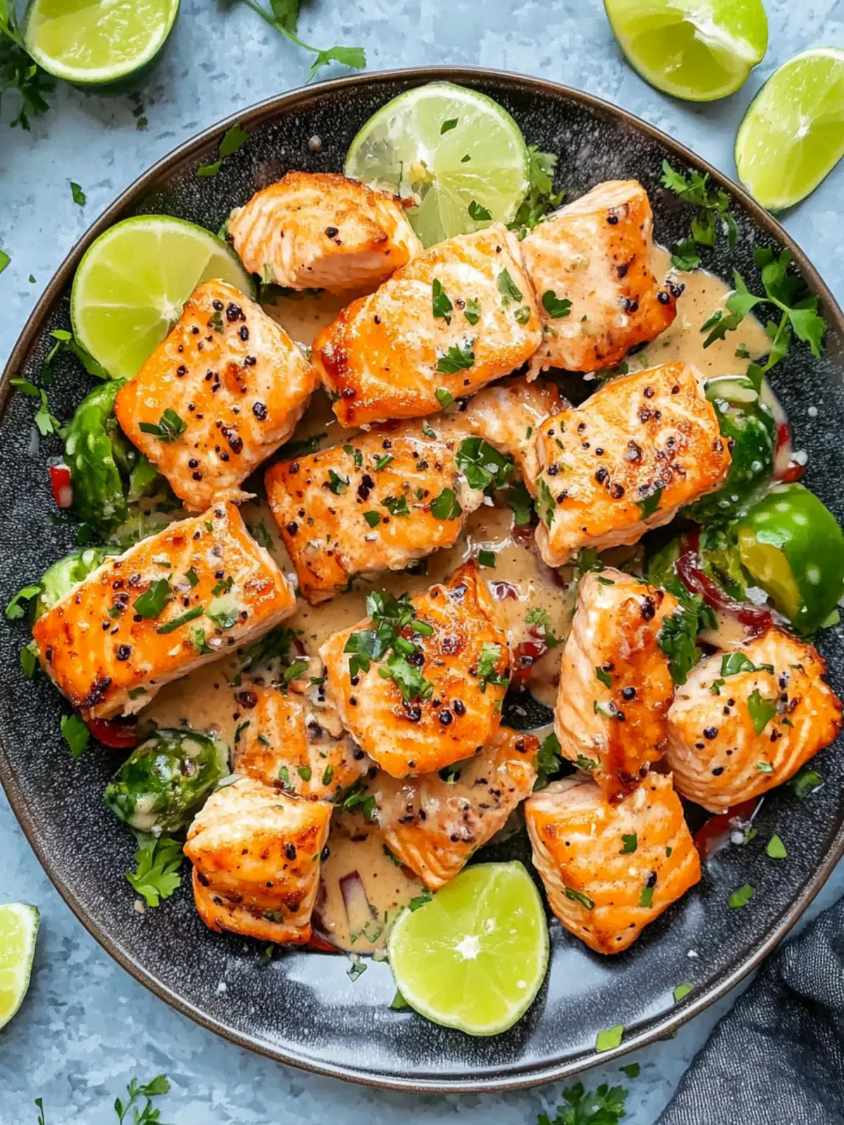 - Place the cooked salmon bites on a platter, drizzle with the Bang Bang sauce, and serve any remaining sauce on the side.