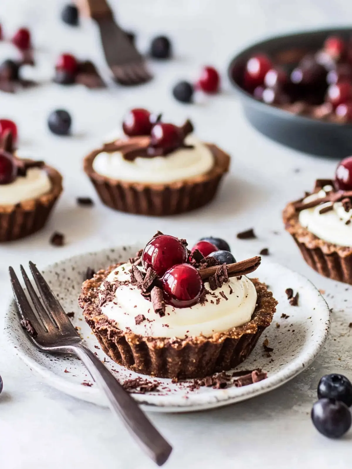 Garnish and Serve: Finally, decorate your Black Forest Tarts with whole cherries and chocolate shavings before serving. This finishing touch not only looks stunning but adds extra flavor!