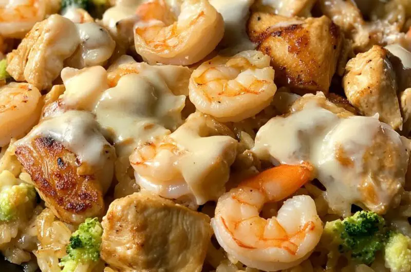 By combining the heartiness of chicken, the succulence of shrimp, and the irresistible creaminess of cheese, this meal captures the essence of fusion cooking. It balances texture and taste, satisfying those craving bold flavors, cheesy richness, and the warmth of a home-cooked meal.