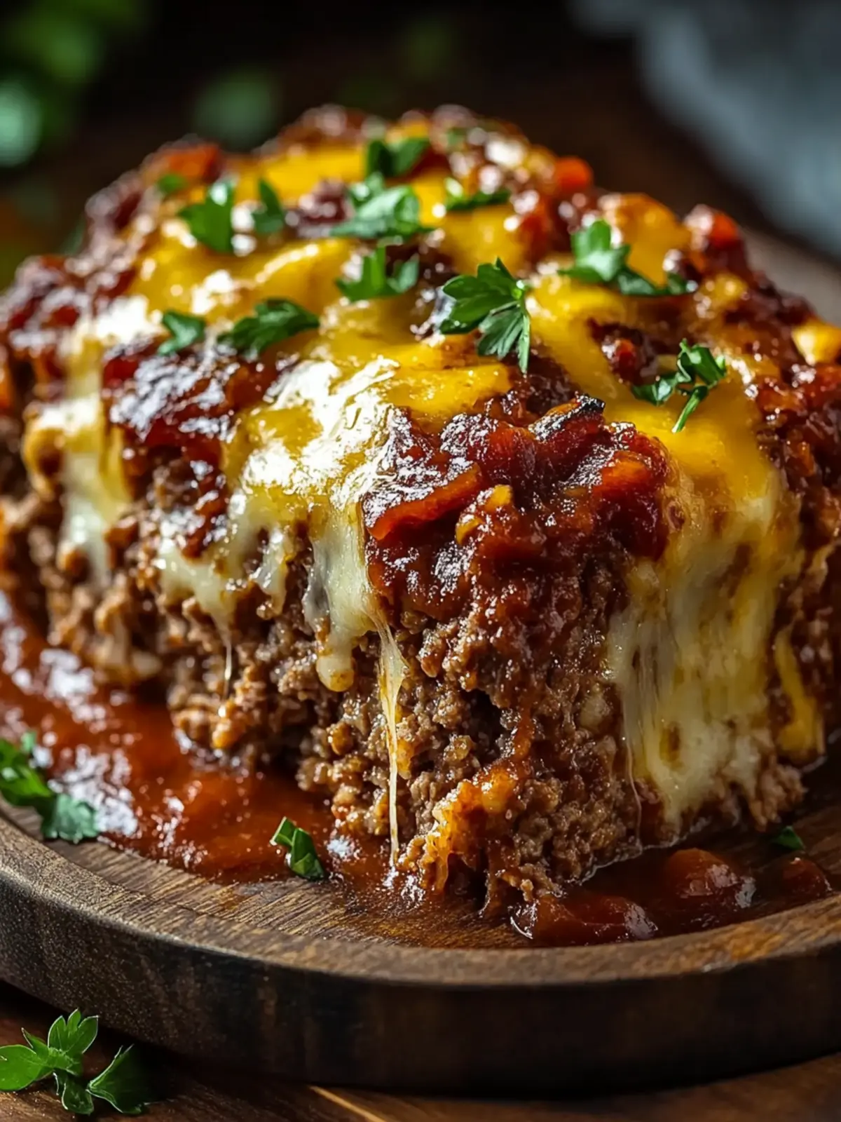 Add Topping: Once baked, spread your creamy mashed potatoes over the meatloaf base evenly. Sprinkle melted cheddar cheese and crumbled bacon on top for that ultimate cheesy delight!