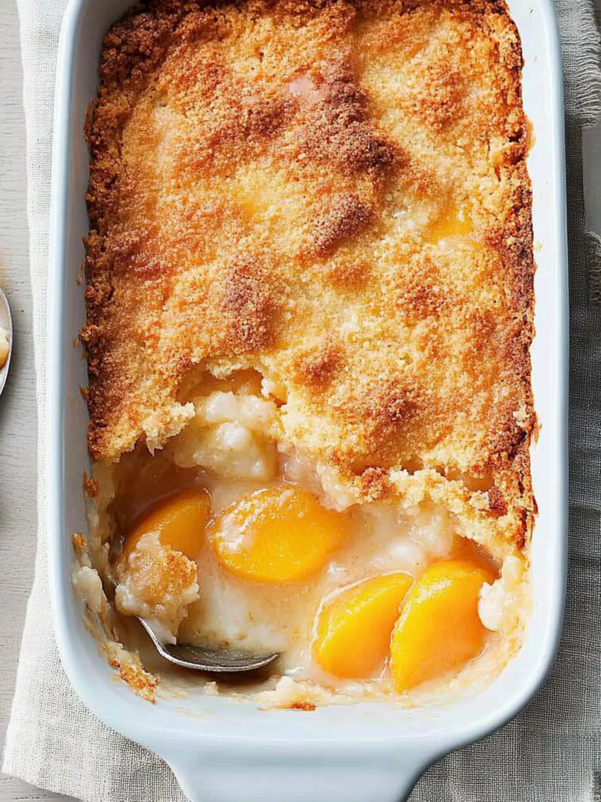 Combine: Carefully pour the batter over the melted butter in the baking dish. Spoon your hot peach mixture, juice included, over the batter. For an extra touch, sprinkle the remaining sugar on top.