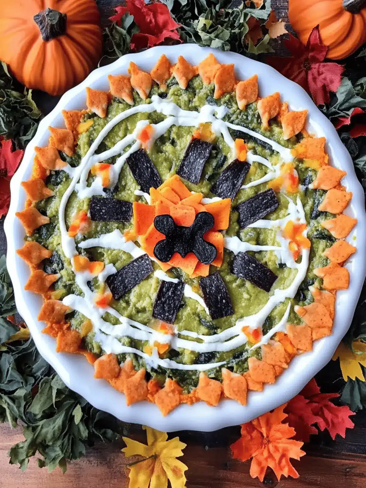 Pipe the remaining ½ cup of sour cream into a zip-lock bag, cut a tiny corner off, and carefully create a spider web design over the guacamole for a spooky touch.