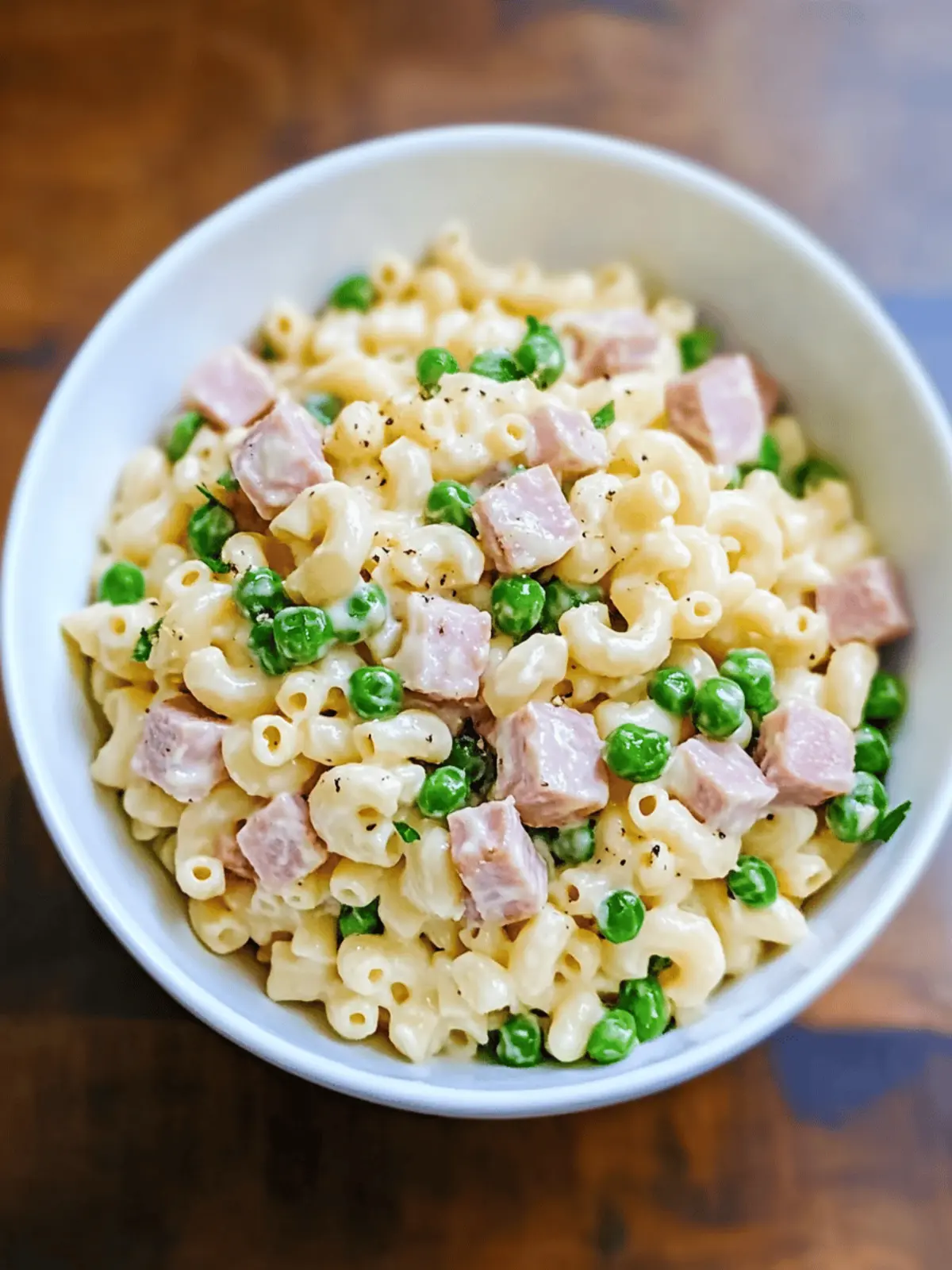 - In a large mixing bowl, combine the cooled macaroni with chopped ham and peas. Toss gently to distribute everything evenly.