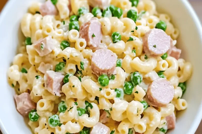 - Combine ingredients: In a large mixing bowl, combine the cooled macaroni with chopped ham and peas. Toss gently to distribute everything evenly.
