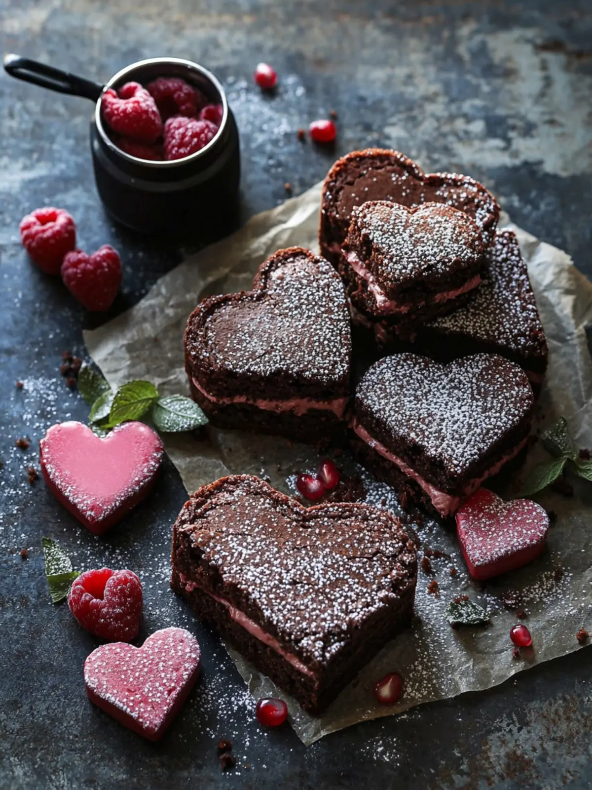 Assemble: Pipe a generous amount of raspberry buttercream onto one brownie heart and press another heart on top to create a delightful sandwich. Sprinkle a dusting of powdered sugar on top for a finishing touch.