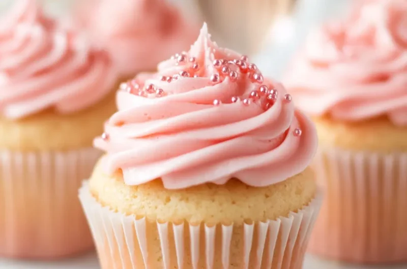 - Frost the cooled cupcakes with the buttercream and optionally top with pink pearl sprinkles.
