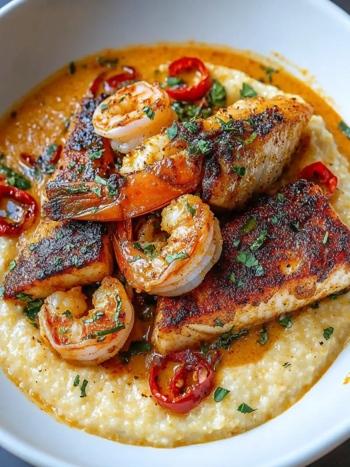 - Spoon the creamy grits onto plates, layer the crispy red snapper and Cajun shrimp on top, and drizzle generously with Cajun cream sauce.