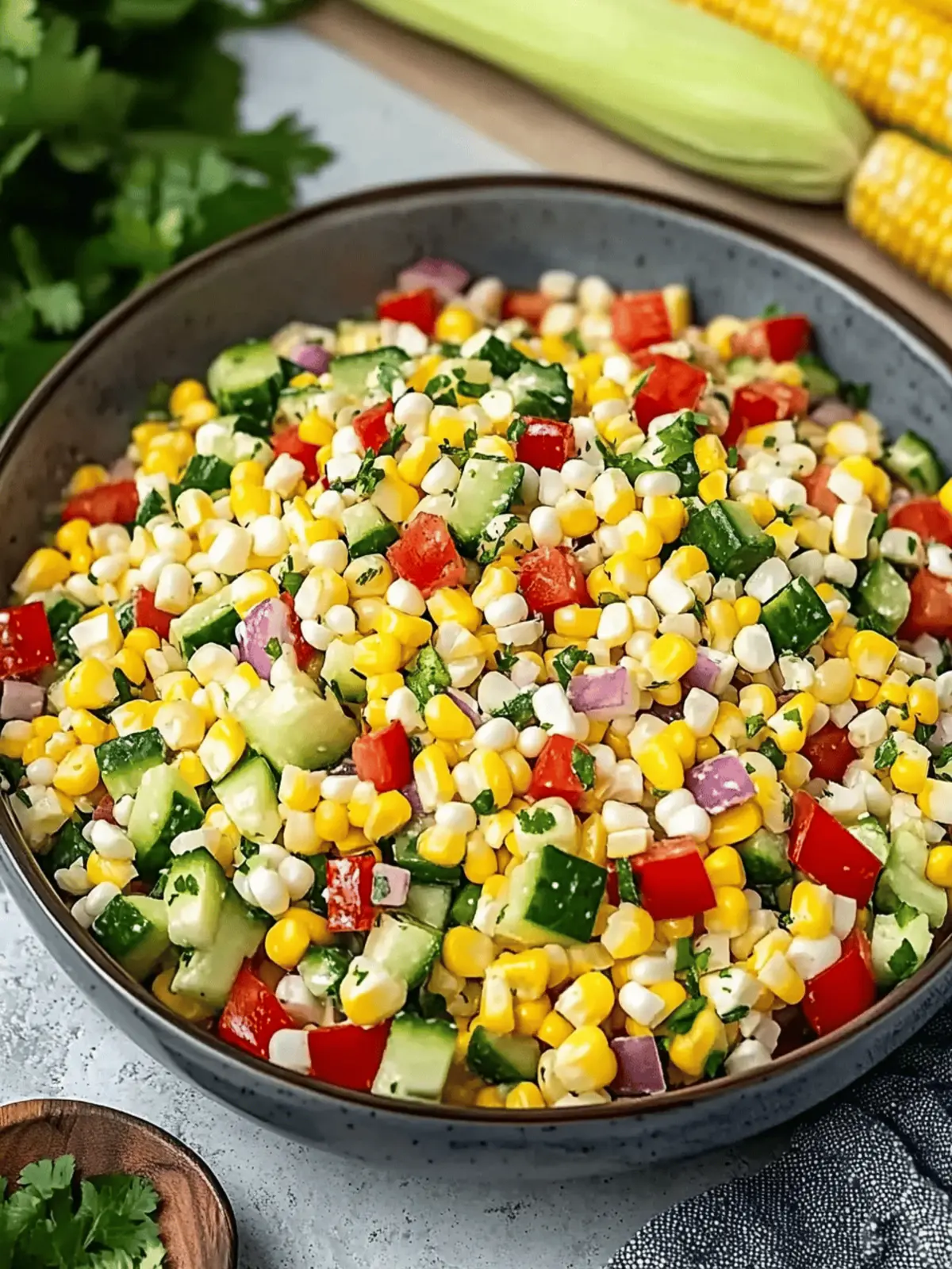 Vibrant, Colorful Dish: This salad is a showstopper with its bright yellow corn, red tomatoes, and green cucumbers, making it visually appealing at any gathering.