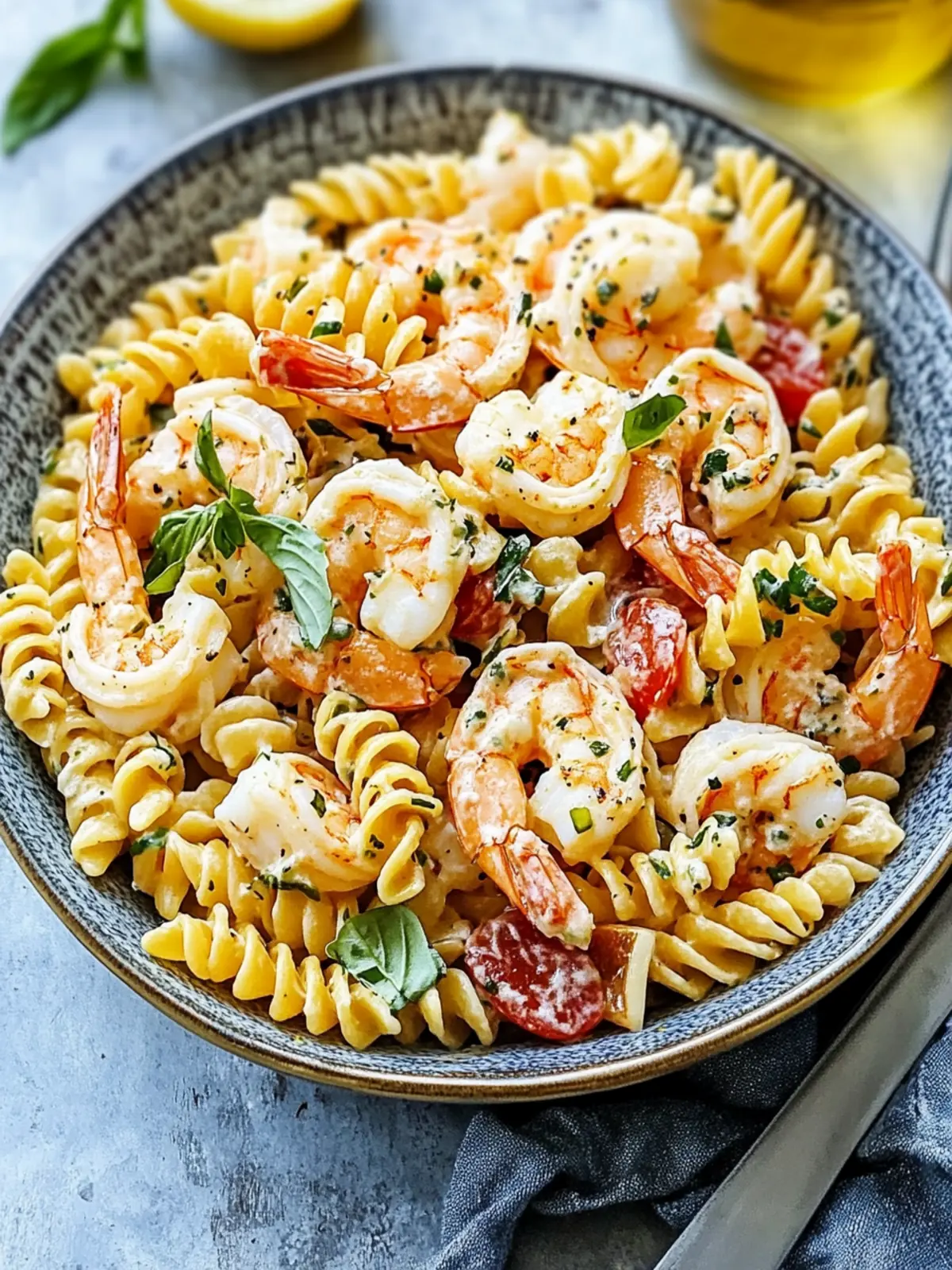 - Combine: In a large mixing bowl, mix cooled pasta, shrimp, imitation crab, chopped vegetables, and dressing until well-coated.