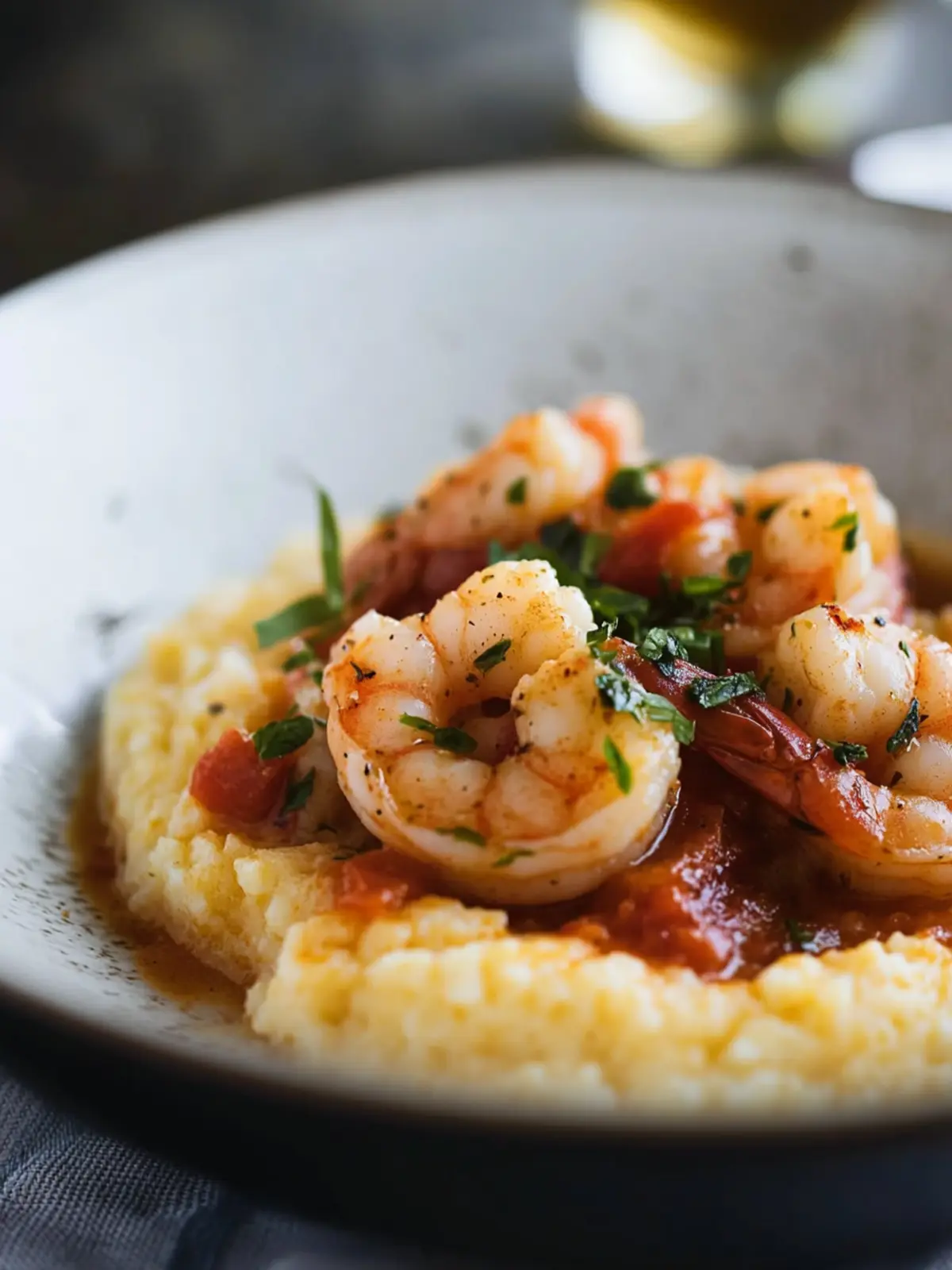 - Spoon a generous portion of the creamy grits onto each plate and ladle the warm shrimp and tomato sauce over the top. Garnish with diced scallions.
