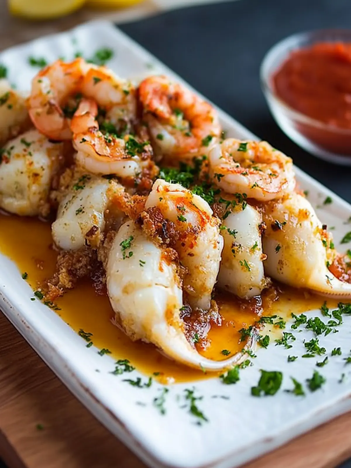 - Arrange the squid on a serving platter, spoon the rich tomato sauce over the top, garnish with crispy fried tentacles and chopped parsley, and serve.
