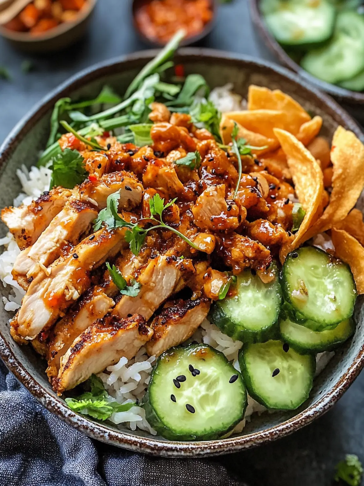 - Serve the chicken over a bed of cooked rice in bowls. Garnish generously with fresh cucumber, creamy avocado, kimchi, and crispy fried wontons for an exciting crunch.