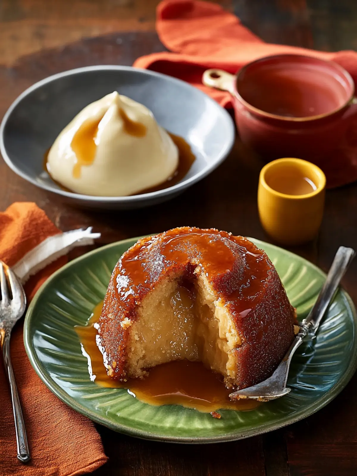 Invert your pudding onto a plate and generously drizzle the warm caramel sauce over it. Serve with whipped cream or a scoop of vanilla ice cream for a deliciously indulgent finish.