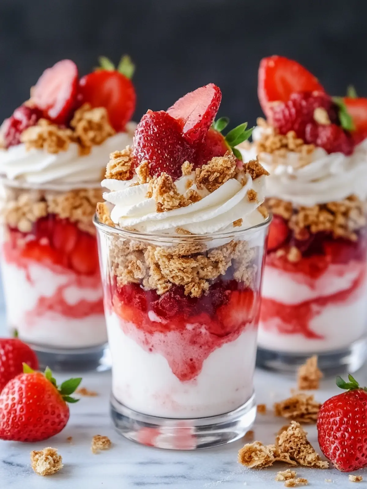Irresistible layers: Each parfait is a visual delight, featuring vibrant strawberries, creamy cheesecake, and a buttery graham cracker crust.