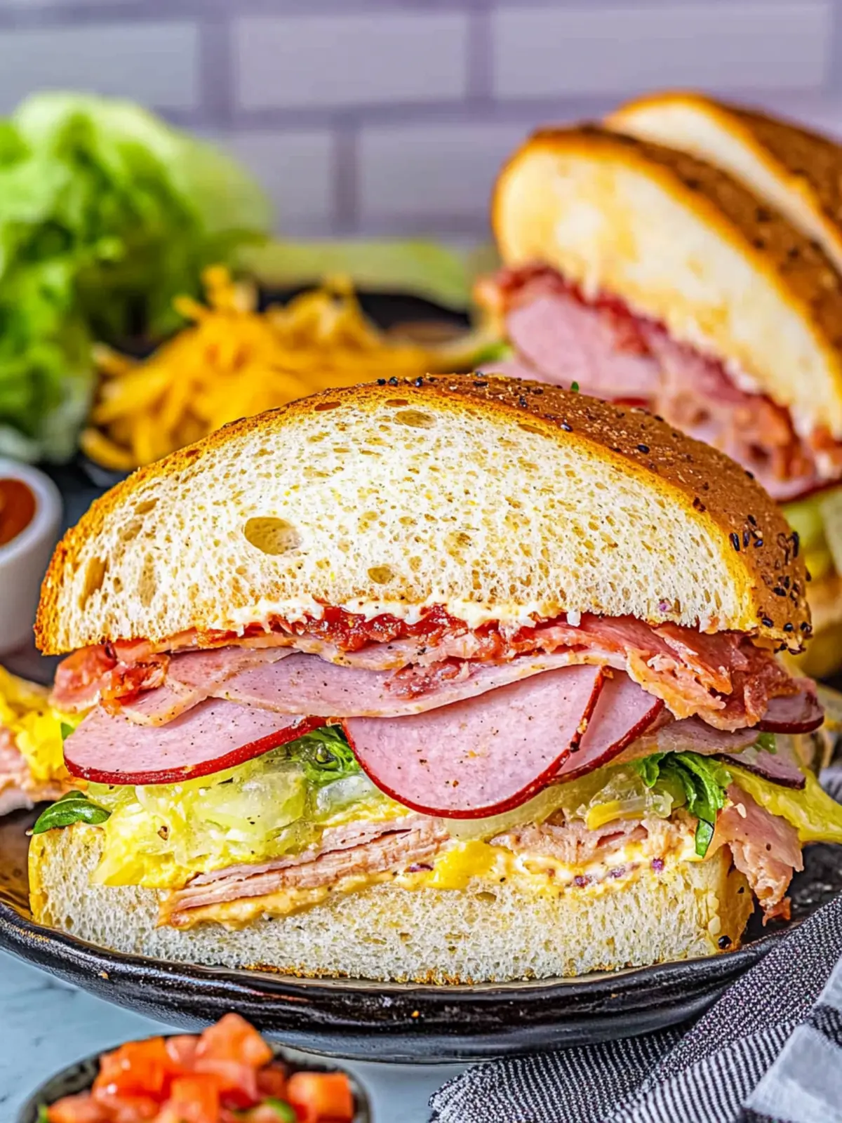 Savory Layers: This sandwich boasts a delightful mix of deli meats and cheeses, creating a rich flavor experience.