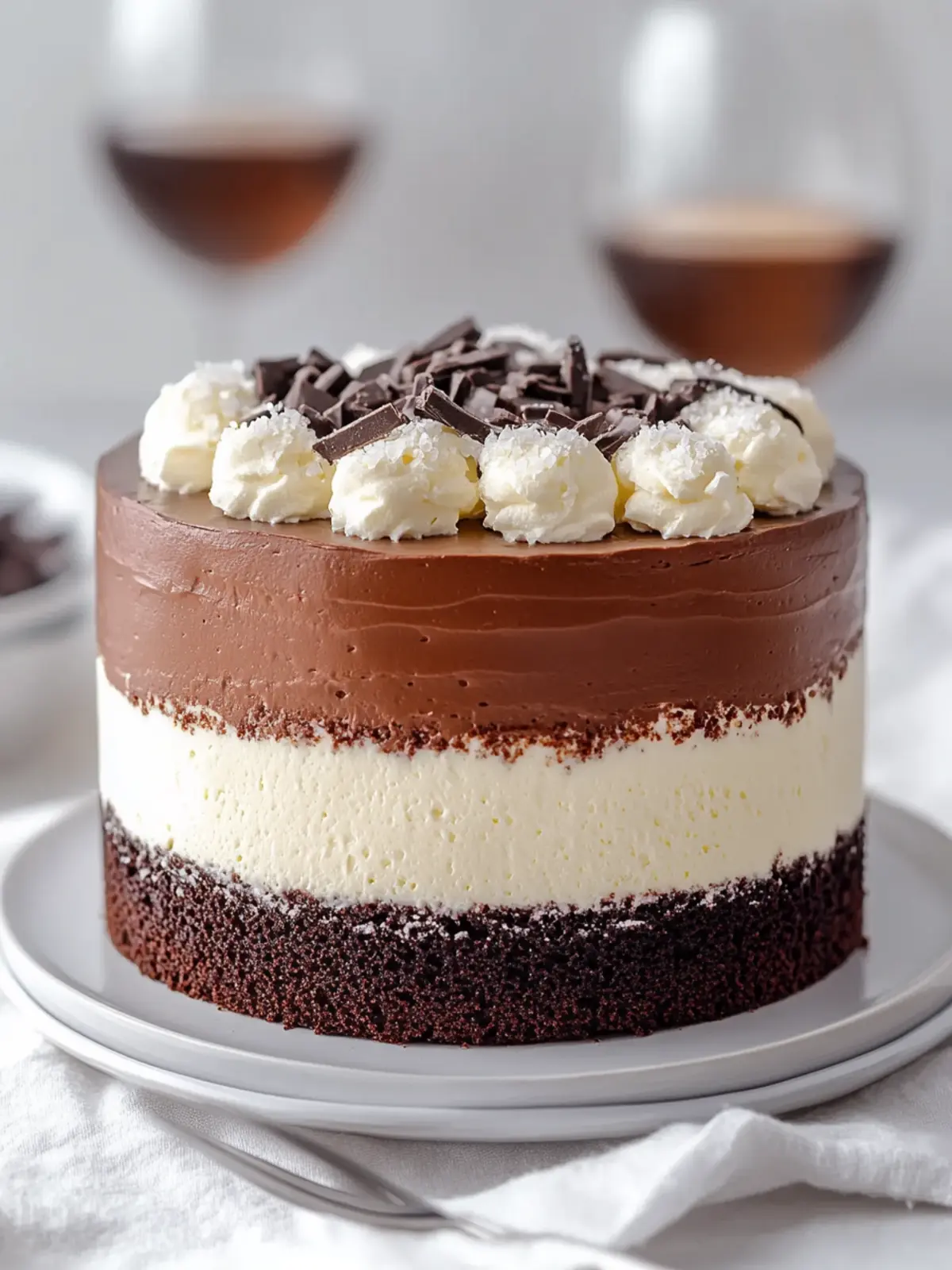 Assemble the Cake: After cooling, place one cake layer on a serving plate. Spread the dark chocolate mousse evenly over the top, then add the second cake layer. Top with the white chocolate mousse and refrigerate for at least 2 hours to set.